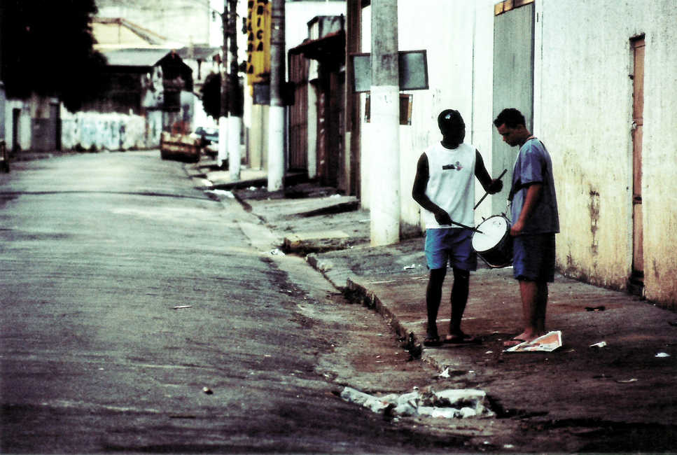 Numa esquina do Bixiga. Mestre e aprendiz sob uma luz dura, contrastante, característica dos trópicos. Aqui os detalhes são ignorados. A luz é exagerada enquanto a sombra não revela nada, nem as folhas da árvore, a sujeira da calçada, a grade do portão, a textura da pele.