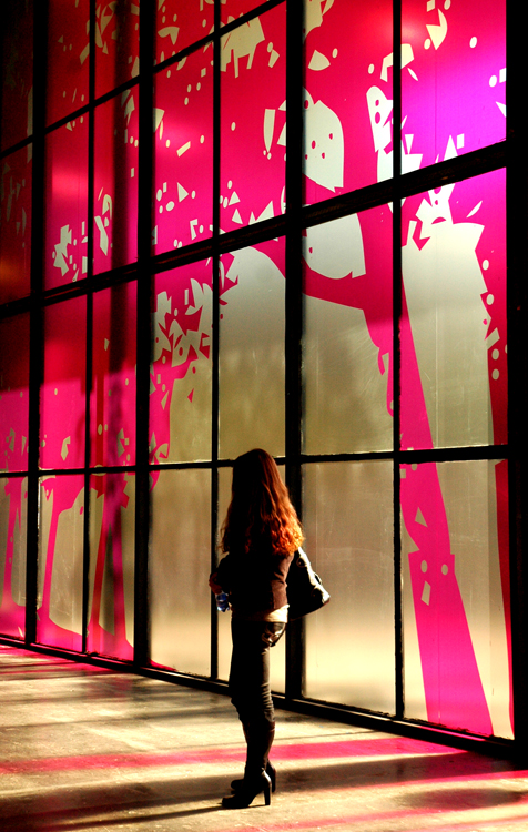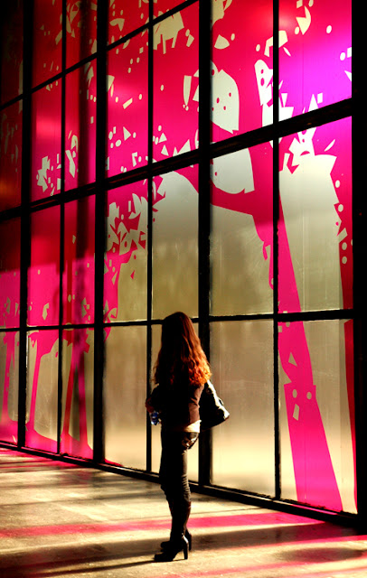 Primeiro você está dentro, a luz vem de fora projetando uma floresta cor de rosa. Depois se vê a luz laranja lá de dentro, que contrasta com o preto da noite. Ambos traz a silhueta de quem espera.